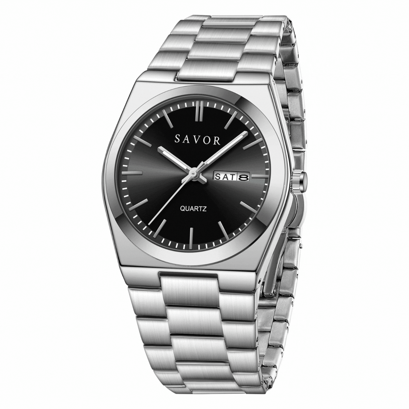 • ساعة ستانلس ستيل بتصميم كلاسيكي داكن يبرز قوة الشخصية دون الحاجة إلى مبالغة.