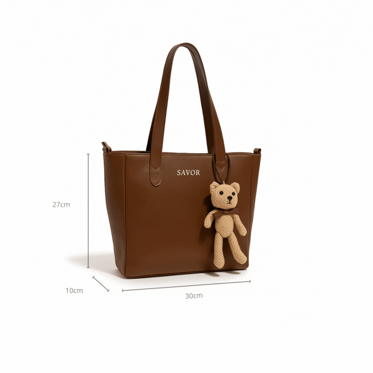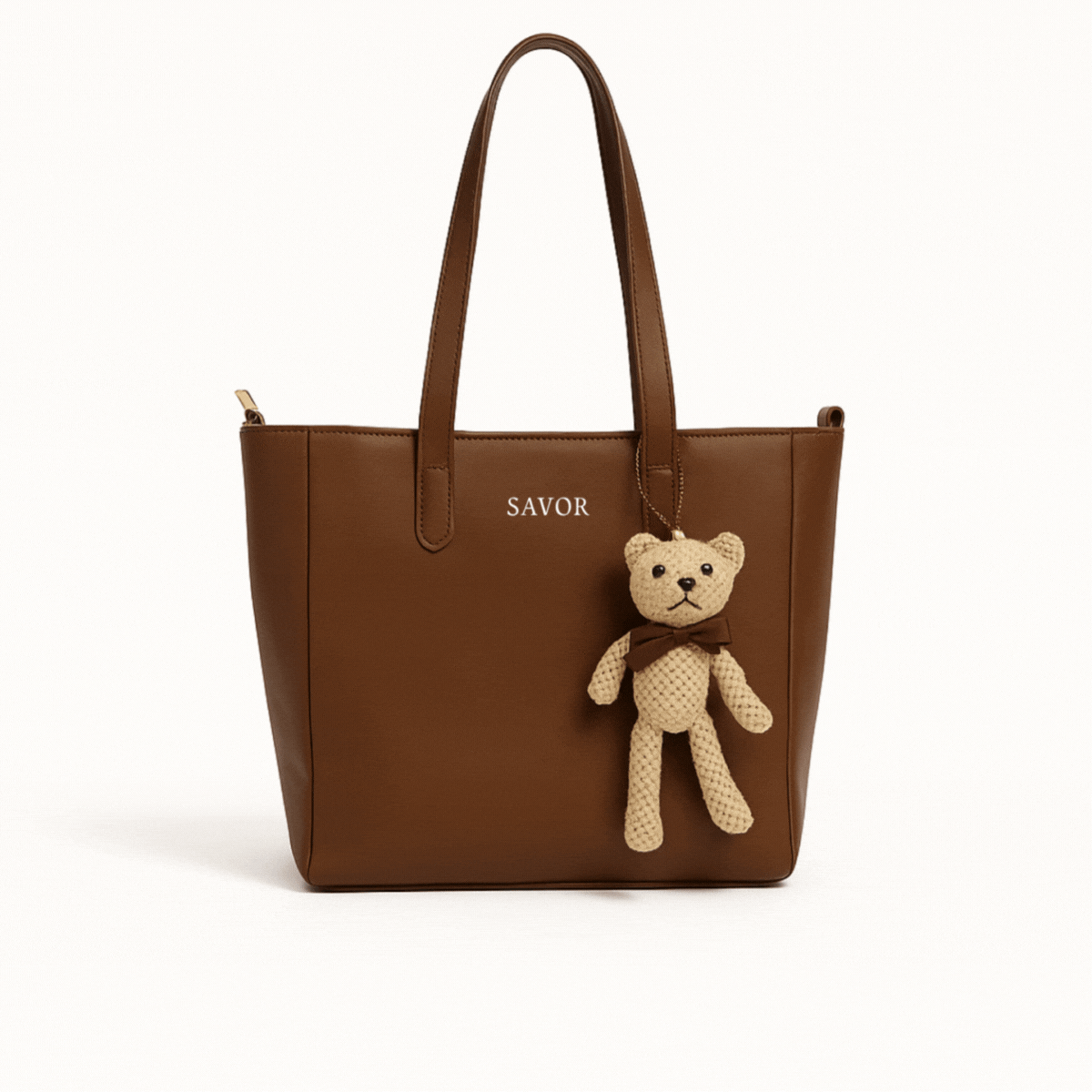 • التفاصيل: شعار "SAVOR" مطبوع بوضوح على الواجهة بلون فاتح، مع دمية دب صغيرة من الكروشيه باللون البيج الفاتح